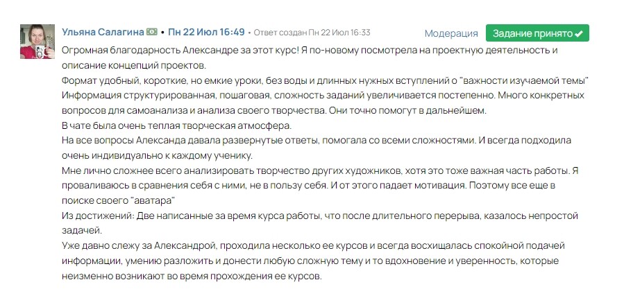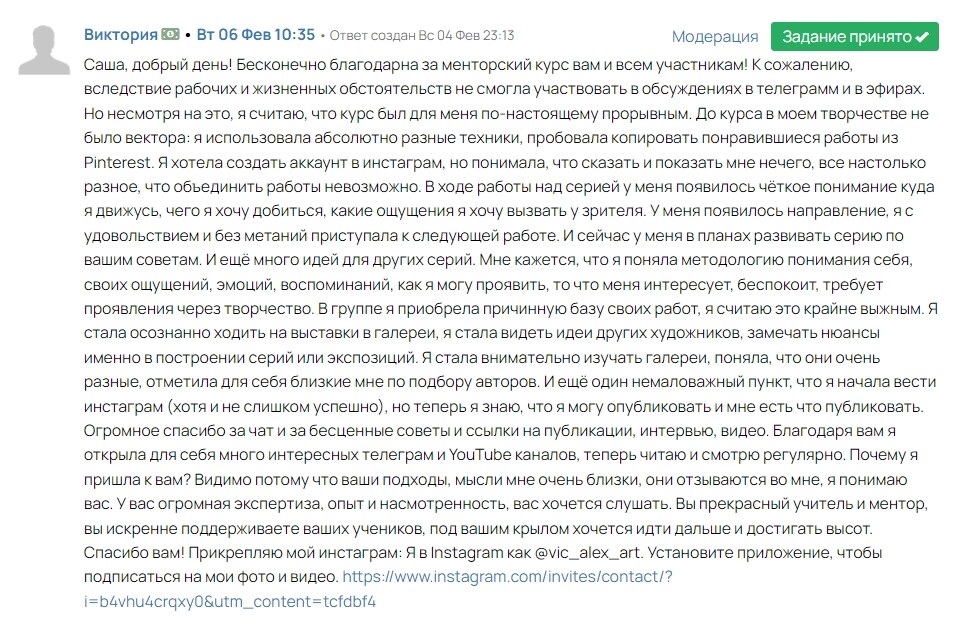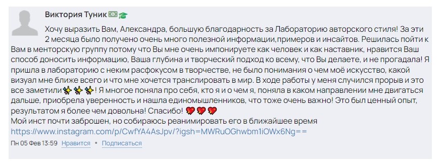 Хочу выразить Вам, Александра, большую благодарность за Лабораторию авторского стиля! За эти 2 месяца было получено очень много полезной информации, примеров и инсайтов. Решилась пойти к Вам в менторскую группу потому что Вы мне очень импонируете как человек и как наставник, нравится Ваш способ доносить информацию, Ваша глубина и творческий подход ко всему, что Вы делаете, и не прогадала! Я пришла в лабораторию с неким расфокусом в творчестве, не было понимания о чем моё искусство, какой визуал мне ближе всего и что мне хочется транслировать в мир. В ходе работы у меня случился прорыв и это все заметили✨✨✨! Я многое поняла про себя, кто я и о чем я, поняла в каком направлении мне двигаться дальше, приобрела уверенность и нашла единомышленников, что тоже очень важно! Это был ценный опыт, результатом я более чем довольна! Спасибо! 💖💖💖Мой инст почти заброшен, но собираюсь реанимировать его в ближайшее время https://www.instagram.com/p/CwfYA4AsJpv/?igsh=MWRuOGhwbm1iOWx6Ng==
