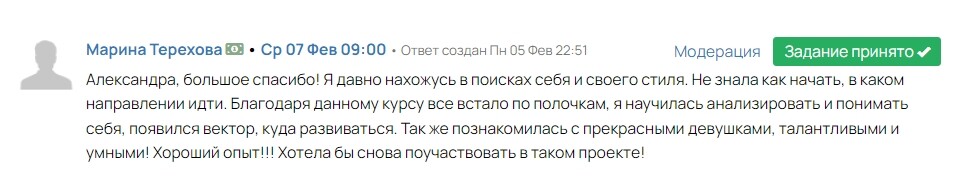 Александра, большое спасибо! Я давно нахожусь в поисках себя и своего стиля. Не знала как начать, в каком направлении идти. Благодаря данному курсу все встало по полочкам, я научилась анализировать и понимать себя, появился вектор, куда развиваться. Так же познакомилась с прекрасными девушками, талантливыми и умными! Хороший опыт!!! Хотела бы снова поучаствовать в таком проекте!