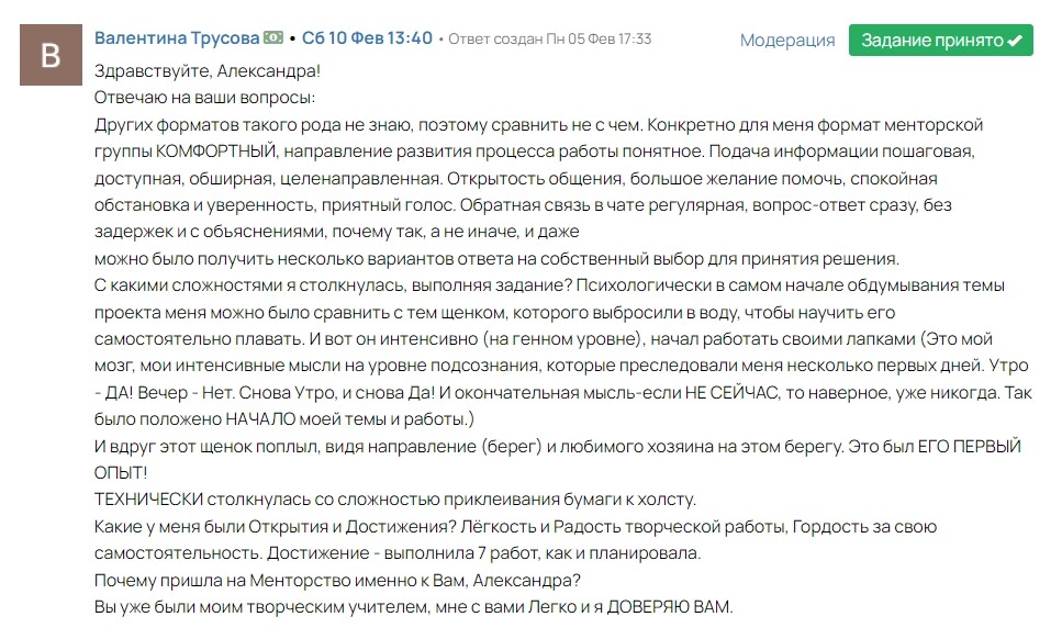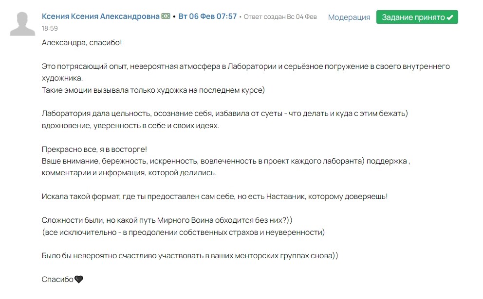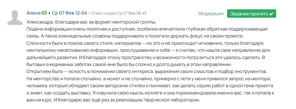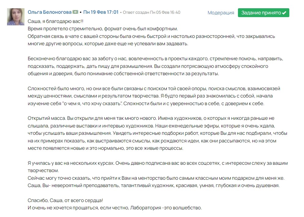 Саша, я благодарю вас!!Время пролетело стремительно, формат очень был комфортным. Обратная связь в чате с вашей стороны была очень быстрой и настолько разносторонней, что закрывались многие другие вопросы, которые даже еще не успевали вам задавать.Бесконечно благодарю вас за заботу о нас, вовлеченность в проекты каждого, стремление помочь, направить, подсказать, поддержать, дать пищу для размышления. Вы создали потрясающую атмосферу спокойного общения и доверия, было понимание собственной ответственности за результаты. Сложностей было много, но они все были связаны с поиском той своей опоры, поиска смыслов, взаимосвязей между ценностями, смыслами и результатом творчества. Я будто первый раз знакомилась с собой, начала изучение себя "о чем я, что хочу сказать". Сложности были и с уверенностью в себе, с доверием к себе. Открытий масса. Вы открыли для меня так много нового. Имена художников, о которых я никогда раньше не слышала, различные выставки и интервью художников. Наши еженедельные эфиры, которые я очень ждала, чтобы услышать ваши размышления. Увидеть интересные подборки работ, которые Вы для нас подбирали, чтобы на их примерах показать, как выстраиваются смыслы, как рождаются идеи, как они рассыпаются, но на этом месте появляется новые и это нормально, это все живые процессы. Я училась у вас на нескольких курсах. Очень давно подписана вас во всех соцсетях, с интересом слежу за вашим творчеством. Сейчас могу точно сказать, что прийти к Вам на менторство было самым классным моим подарком для меня же. Саша, Вы- невероятный преподаватель, талантливый художник, красивая, умная, глубокая и очень душевная. Спасибо, Саша, от всего сердца! И очень не хочется прощаться, если честно, Лаборатория - это волшебство.