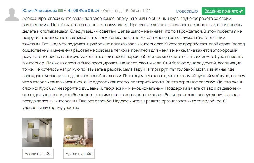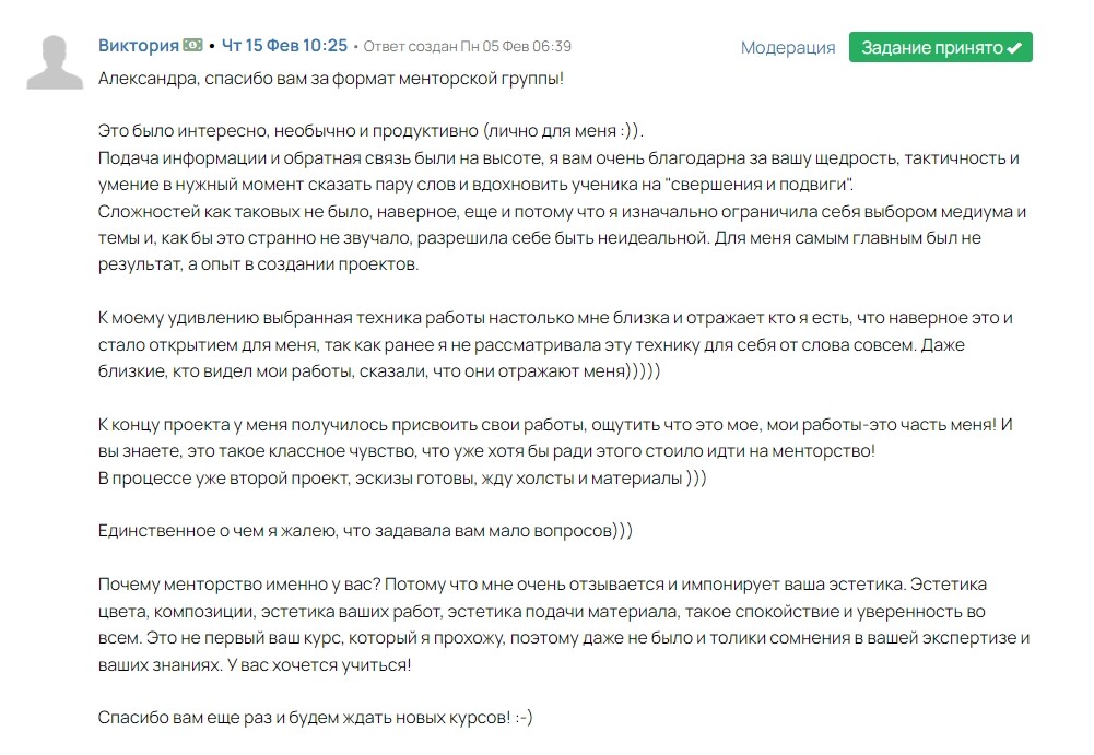 В процессе уже второй проект, эскизы готовы, жду холсты и материалы )))Единственное о чем я жалею, что задавала вам мало вопросов)))Почему менторство именно у вас? Потому что мне очень отзывается и импонирует ваша эстетика. Эстетика цвета, композиции, эстетика ваших работ, эстетика подачи материала, такое спокойствие и уверенность во всем. Это не первый ваш курс, который я прохожу, поэтому даже не было и толики сомнения в вашей экспертизе и ваших знаниях. У вас хочется учиться!