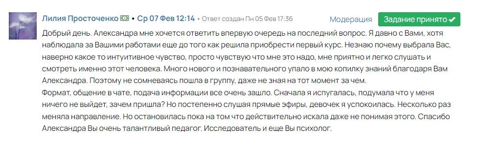 Формат, общение в чате, подача информации все очень зашло. Сначала я испугалась, подумала что у меня ничего не выйдет, зачем пришла? Но постепенно слушая прямые эфиры, девочек я успокоилась. Несколько раз меняла направление. Но остановилась пока на том что действительно искала даже не понимая этого. Спасибо Александра Вы очень талантливый педагог. Исследователь и еще Вы психолог.