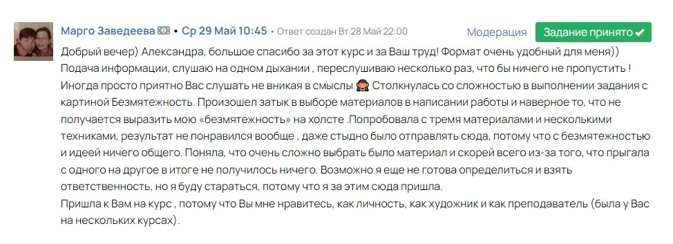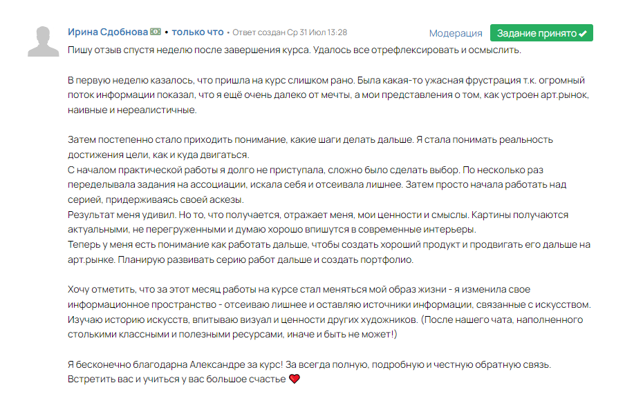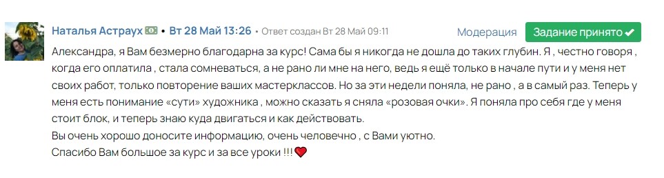 Александра, я Вам безмерно благодарна за курс! Сама бы я никогда не дошла до таких глубин. Я , честно говоря , когда его оплатила , стала сомневаться, а не рано ли мне на него, ведь я ещё только в начале пути и у меня нет своих работ, только повторение ваших мастер-классов. Но за эти недели поняла, не рано , а в самый раз. Теперь у меня есть понимание «сути» художника , можно сказать я сняла «розовая очки». Я поняла про себя где у меня стоит блок, и теперь знаю куда двигаться и как действовать.