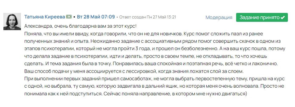 Поняла, что вы имели ввиду, когда говорили, что он не для новичков. Курс помог сложить пазл из ранее полученных знаний и опыта. Неожиданно задание с ассоциативным рядом помогло совершить скачок в одном из этапов психотерапии, который не могла пройти 3 года, и прошел он безболезненно. А на ваш курс пошла, потому что делала задание в психотерапии, идти и делать, просто в своем темпе, не откладывать, то что хочешь сделать. И тема задания была в точку.